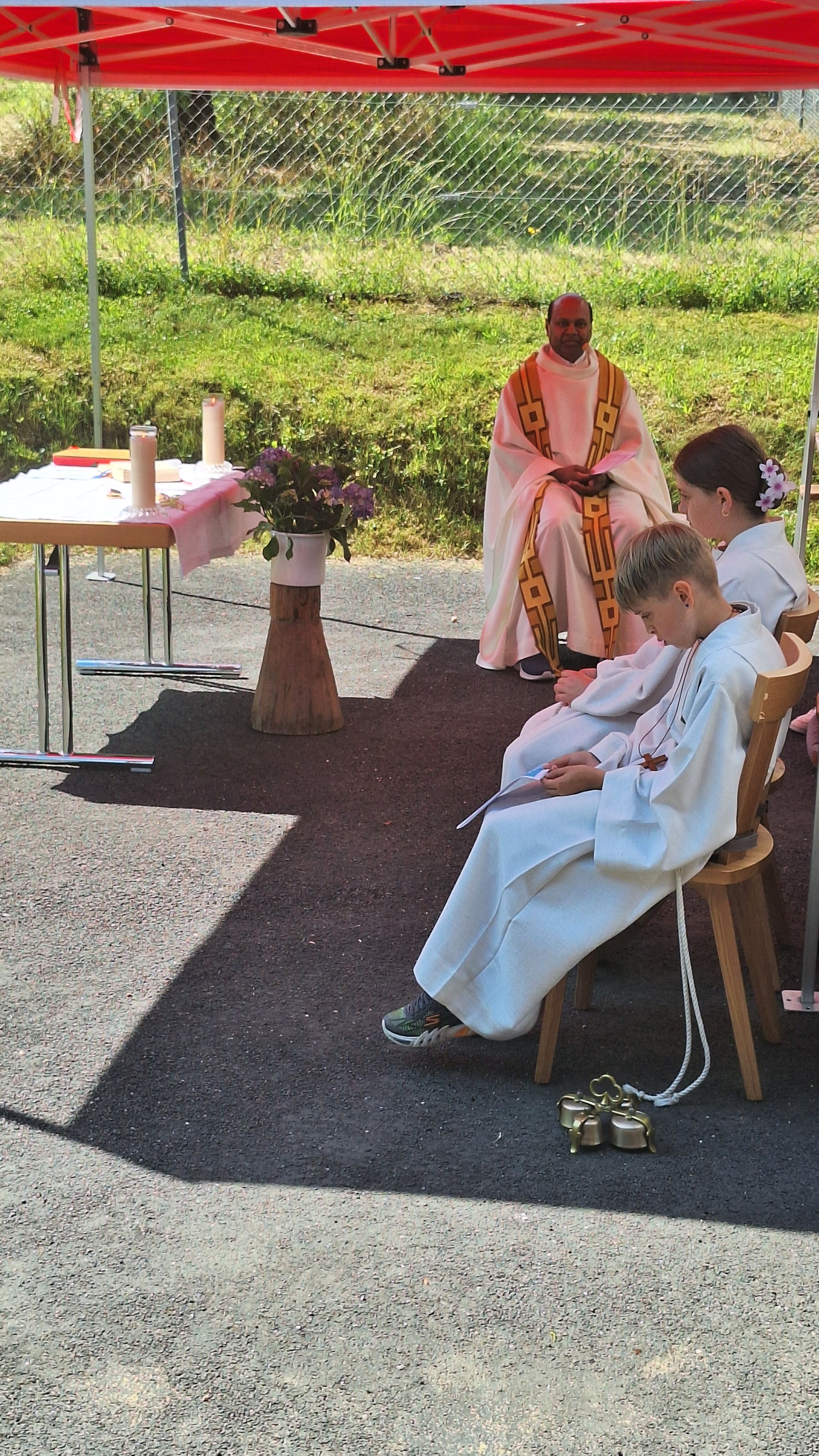 Auch die ersten Erstkommunionskinder kommen mir ihren Eltern vorbei, denn bei ihnen gehört Fronleichnam noch zum Erstkommunionsprogramm. Sie werden die Fürbitten lesen.