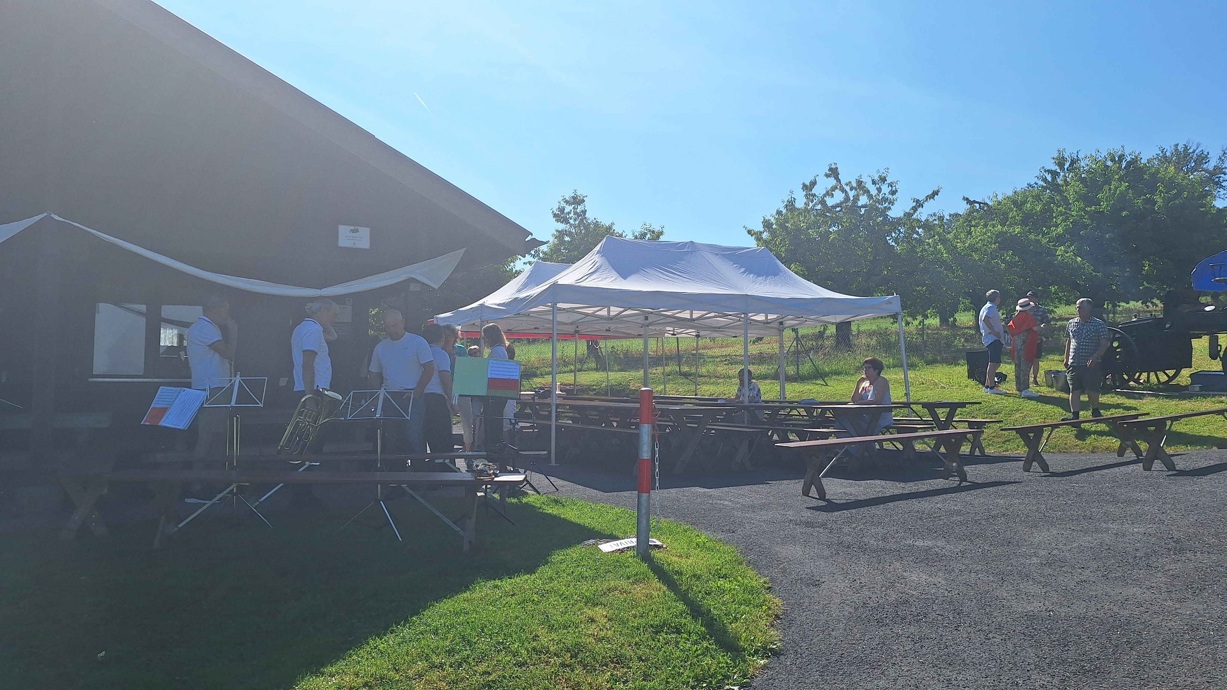 Um 9 Uhr treffen die restlichen Männer ein um die Zelte, Tische, Bänke, Altar, etc. aufzustellen. Die Sonne brennt jetzt schon und es muss für genügend Schattenplatz gesorgt werden. Die Allmendhütte ist voller Leben. Hier wird was gemacht und da wird was aufgestellt.