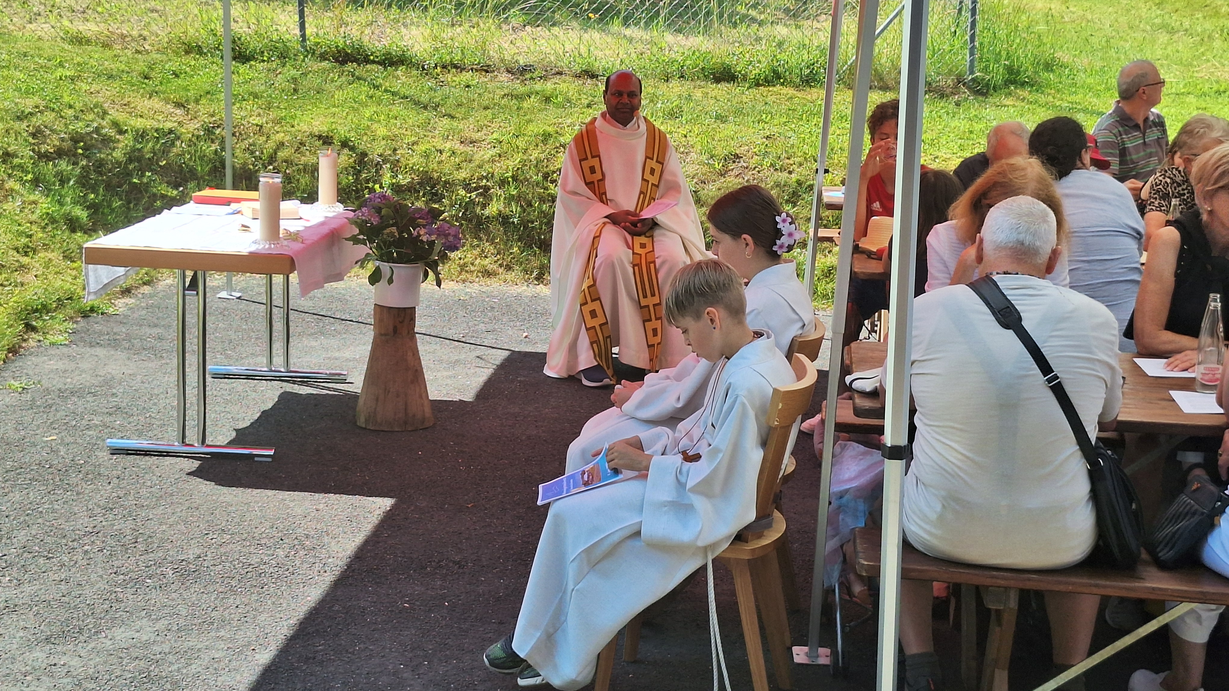 Langsam geht es Richtung 10.30 Uhr. Alle sind parat. Das Buffet bestückt, die Suppe am garen, die Feuerstelle in Betrieb. Die Bänke schon sehr gut besetzt. Dann kann es ja losgehen. Und Pfarrer Gregory Polishetti hat versprochen nicht zu lange zu machen in diesem Jahr. Nun, er hat Wort gehalten. Ganz so lange wie letztes Jahr ging es nicht. Um 11.45 Uhr , nachdem der Sakristan noch eine Ministrantin verabschiedet hatte, war der Gottesdienst zu Ende.