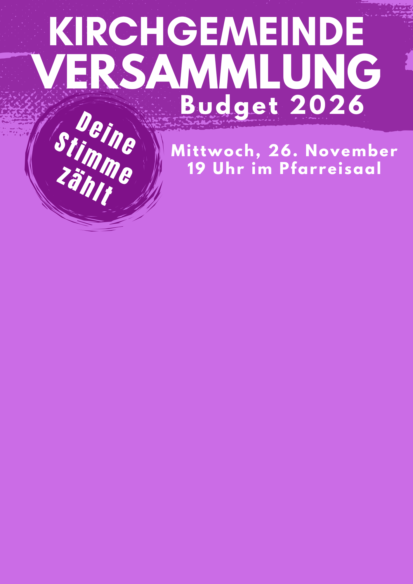 Der Voranschlag 2026 inkl. Traktanden und Anträge wurde am 10. November 2025 vom Kirchgemeinderat genehmigt und liegt ab 12. November 2025 gemäss KGV - Beschluss vom 23.11.1993 im Schriftenstand der Kirchen Breitenbach und Fehren, im Gemeindehaus Breitenbach und im Pfarreisekretariat zum Bezuge auf.